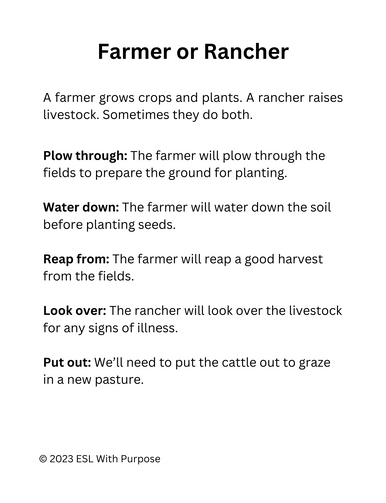 Discover different jobs, ranging from architect to farmer, students can explore the different careers and color, plus read and practice phrasal verbs related to the career.