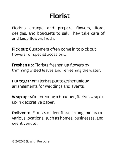 Discover different jobs, ranging from architect to farmer, students can explore the different careers and color, plus read and practice phrasal verbs related to the career.